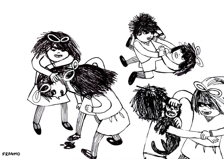 Franmo: I’d probably spend about one month shopping for clothes and shoes. Lame I know, but it’s true. Then I’d get bored, so maybe I’d go to some exotic country and explore. Then I would come back and live like a trust-fund baby in an overpriced loft somewhere, painting and getting high all day. Seriously though, I would really love to get an MFA in art or illustration. I would probably write and illustrate children’s books, not caring whether or not they got published. Maybe I’d work towards getting a solo show so I can drink free wine. The possibilities are endless.