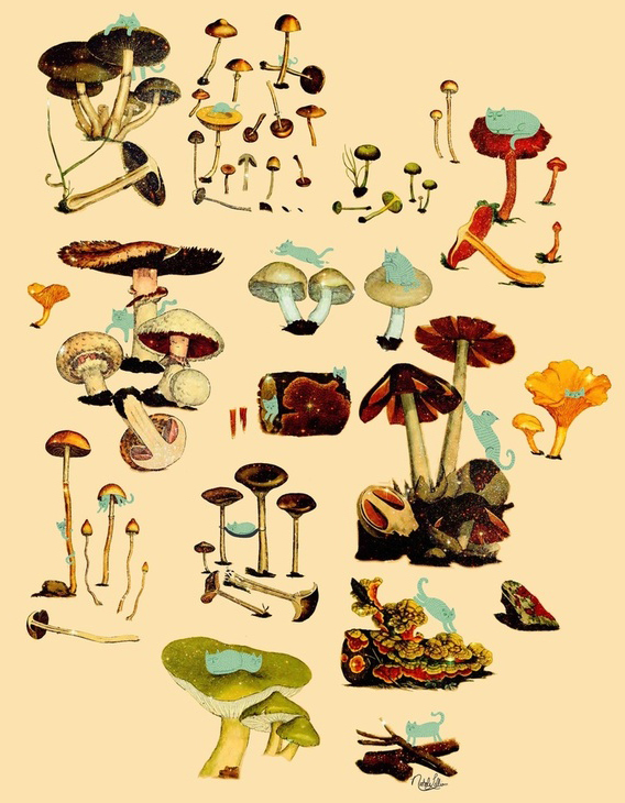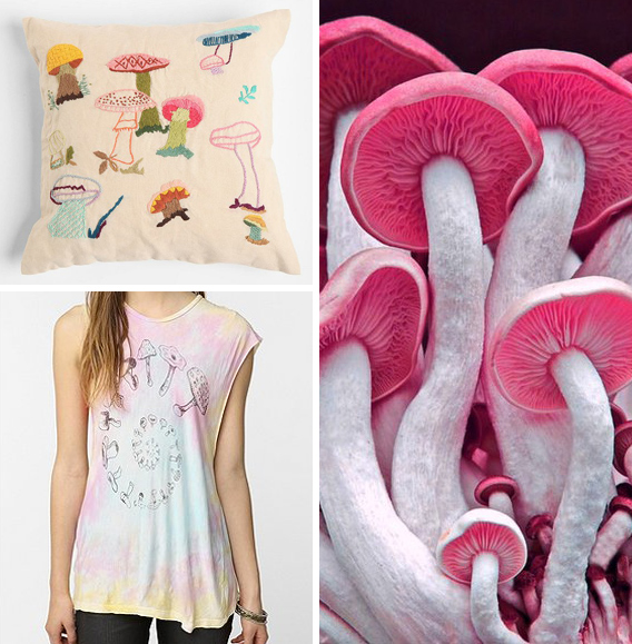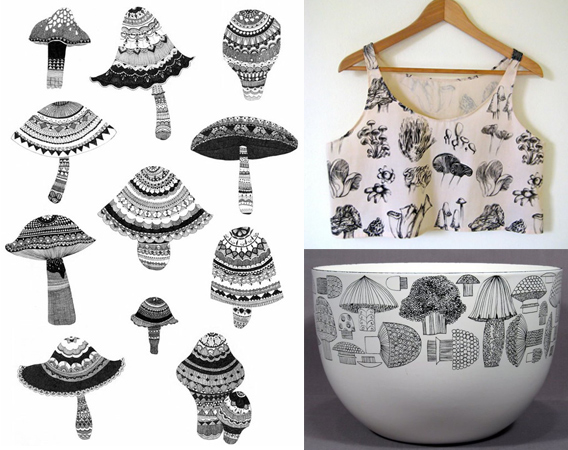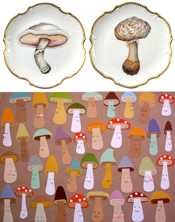 With both conversational prints and 70s motifs trending, it’s no surprise we’re seeing a return of the mighty mushroom. I’ve always been a fan of seeing these guys used as subject matter, and there are several items shown below that may have to find their way home with me. I wouldn’t mind this whole set of mushroom plates by Anna Weatherley.
