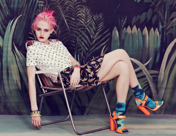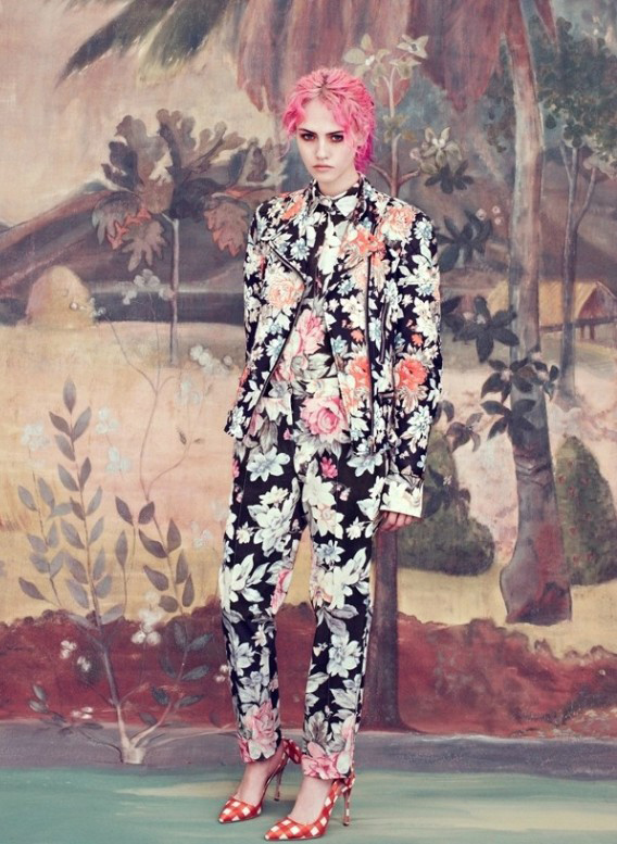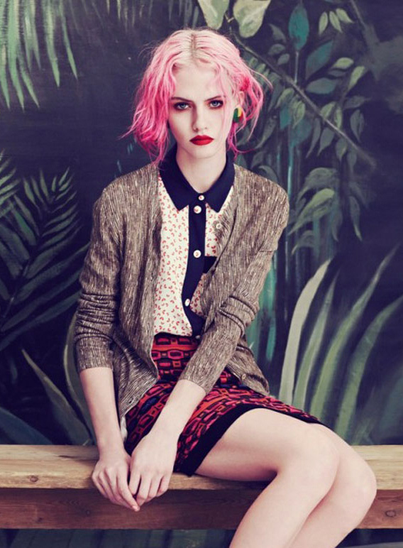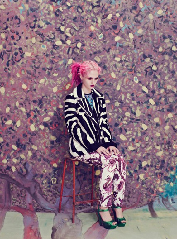 I would need additional fingers on my hands in order to count all of the things that I love about this editorial from the December 2011 issue of Wonderland Magazine. Featuring model Charlotte Free, styled by Grace Cobb and photographed by Elena Rendina, the concept for this photo shoot combines numerous overlapping trends, including [but not limited to] head-to-toe print coverage, print mixing, surrealism, mixed media techniques, garden florals, vintage geometrics, graphic backdrops and psychedelic motifs. Most people would likely find this overwhelming, but to, me this shoot was pulled off with the perfect amount of panache and restraint. I am also a huge sucker for pink hued locks.