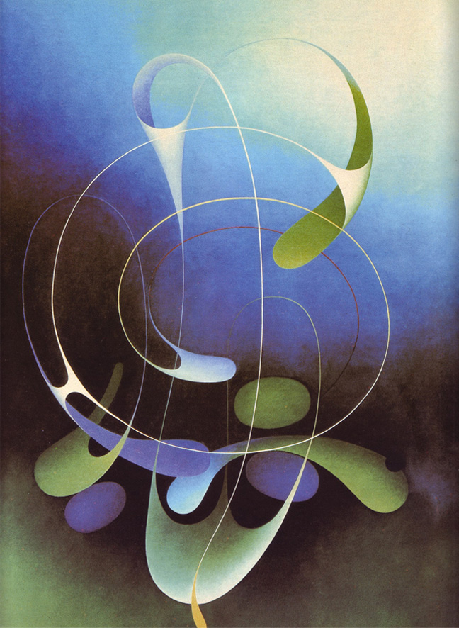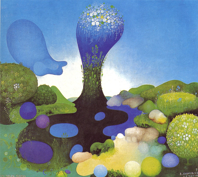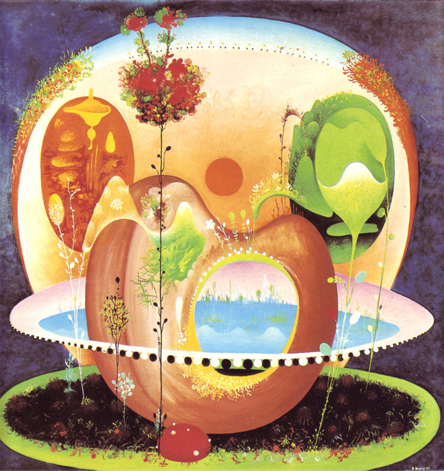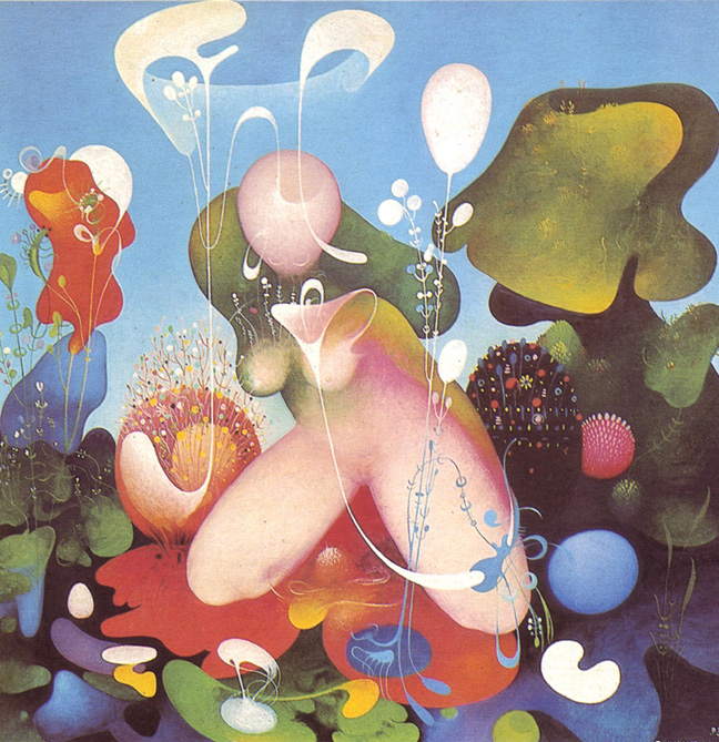 As a textile designer, I have a special appreciation for Vangel Naumovski (1924-2006), a surrealist painter originally hailing from Yugoslavia. The fine, floral detail and his use of color and shading really draw me in, and I see countless individual print motifs within each of his paintings. I also see the influence of my favorite Renaissance painter, Hieronymus Bosch.. interestingly enough, if you read the original post over at 50Watts, you’ll see Bosch mentioned among Naumovski’s influences, along with likes of Kandinsky, Klee, Ernst. As a fan of psychedelic art in general, I would say his gooey, organic shapes and bright, floral details certainly do not disappoint.