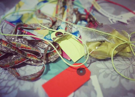 Last night I attended a workshop organized by two incredibly talented ladies, Bri Emery [of DesignLoveFest] and Jen Gotch [of Ban.do]. It was a casual and fun event where creativity took on a new form: the inspiration string. They’ve essentially reinvented the mood board, making it more tactile and 3d and awesome. We were encouraged to bring our own trinkets and ephemera, but of course they supplied us with oodles of colorful and sparkly bits to help us along. And to set the mood just right, this all took place inside of one of the happiest places on earth; Anthropologie. It was almost too much eye candy to handle. I do like how mine came out, and it looks pretty neat in my office, don’t you think?
