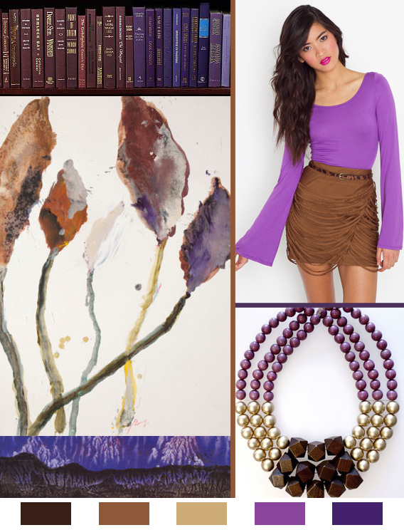 This week’s color palette has some back story, and is the basis of a long-running argument between myself and my dear friend, Thomas. It all boils down to a response he made many years ago, regarding a color combination I sported one day in high school. He declared that purple and brown absolutely do not make a legitimate color combination, which of course defies all of my color-loving logic. To this day we agree to disagree, but I’m the textile designer, and he flies jets for a living.