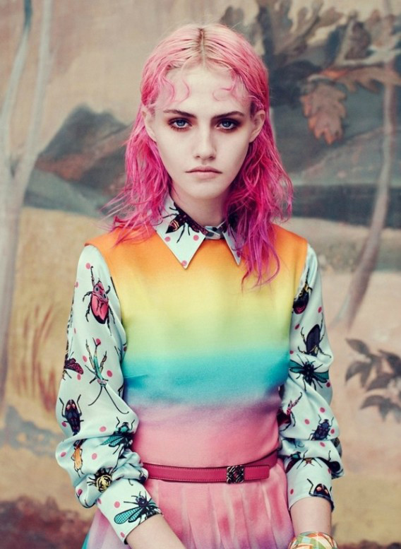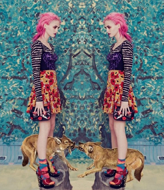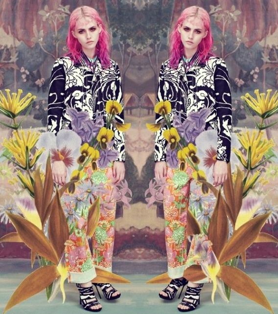 I would need additional fingers on my hands in order to count all of the things that I love about this editorial from the December 2011 issue of Wonderland Magazine. Featuring model Charlotte Free, styled by Grace Cobb and photographed by Elena Rendina, the concept for this photo shoot combines numerous overlapping trends, including [but not limited to] head-to-toe print coverage, print mixing, surrealism, mixed media techniques, garden florals, vintage geometrics, graphic backdrops and psychedelic motifs. Most people would likely find this overwhelming, but to, me this shoot was pulled off with the perfect amount of panache and restraint. I am also a huge sucker for pink hued locks.