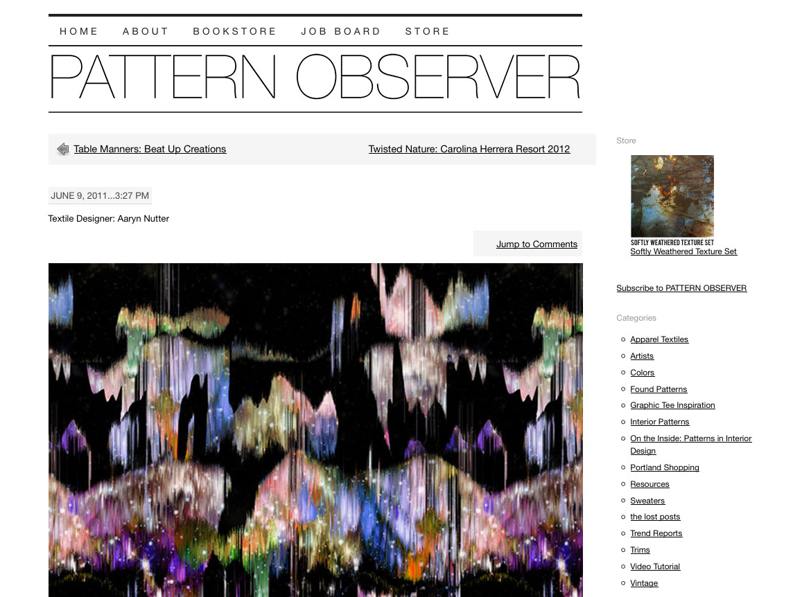 I was extremely thrilled and honored to be featured on one of my all-time favorite blogs, Pattern Observer. If you haven’t been to this site yet, drop everything and check it out right now. It’s an amazing resource for surface designers like myself, fashion designers, or anyone who needs a bit of eye candy to get them through the day. Follow the link below to see the entire post!